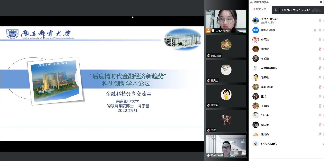 9月16日晚,我院举办“后疫情时代金融科技的发展”线上分享会,会议邀请了南京邮电大学冯宇健、南京航天航空大学虞建两位博士做专题讲座。两位博士阐述了当前计算机技术在金融领域的应用情况,分析了利用计算机技术推动后疫情时代下金融发展的可能性,为同学们的研究方向提供了新的思路。