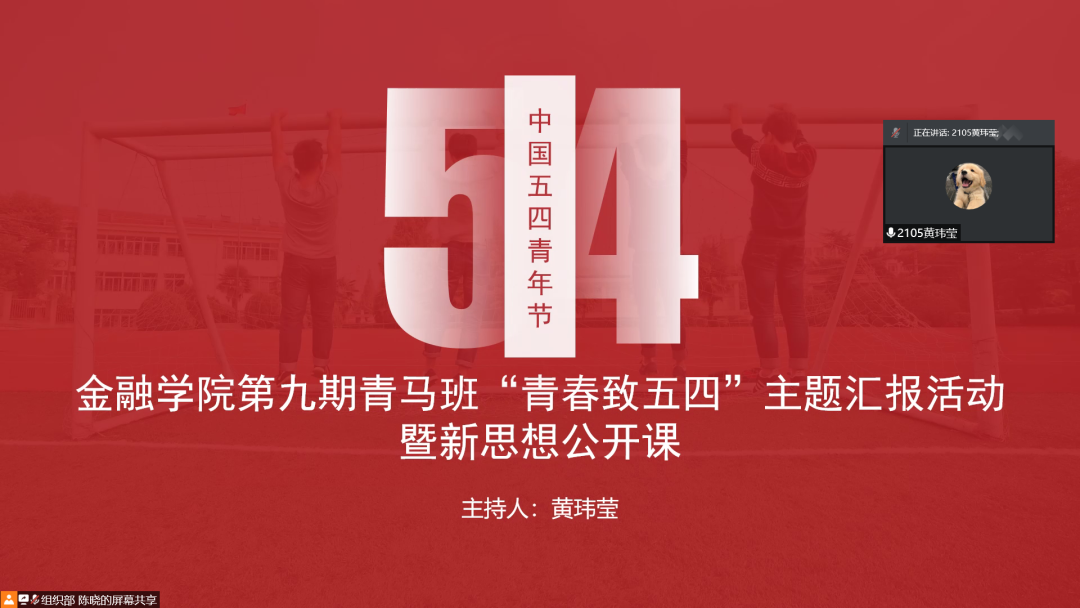 5月3日中午12:15,南京财经大学至尊全讯555050第九期青马班“青春致五四”主题汇报活动暨新思想公开课于腾讯会议线上举行。至尊全讯555050分团委组织部全体成员、至尊全讯555050第九期青马班全体学员参加此次会议,主持人为至尊全讯555050分团委组织部项目志愿者黄玮莹。