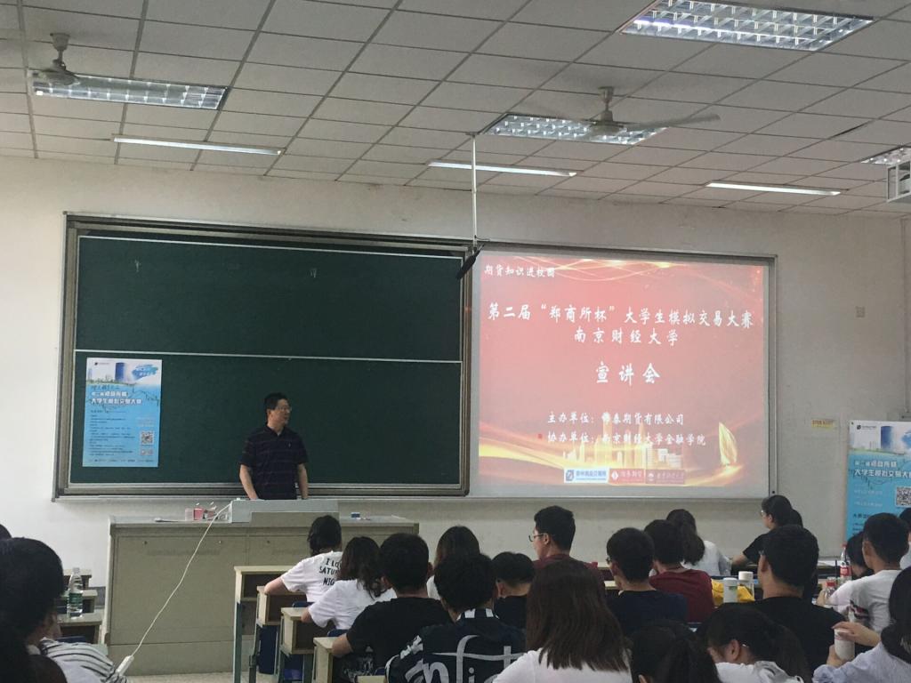 6月5日下午,期货知识进校园暨第二届“郑商所杯”大学生模拟交易大赛宣讲会在仙林校区德经楼117教室成功举行。我院投资学系全体学生参加了本次活动,锦泰期货谢景炎老师和俞水祥老师担任本次活动的主讲人。