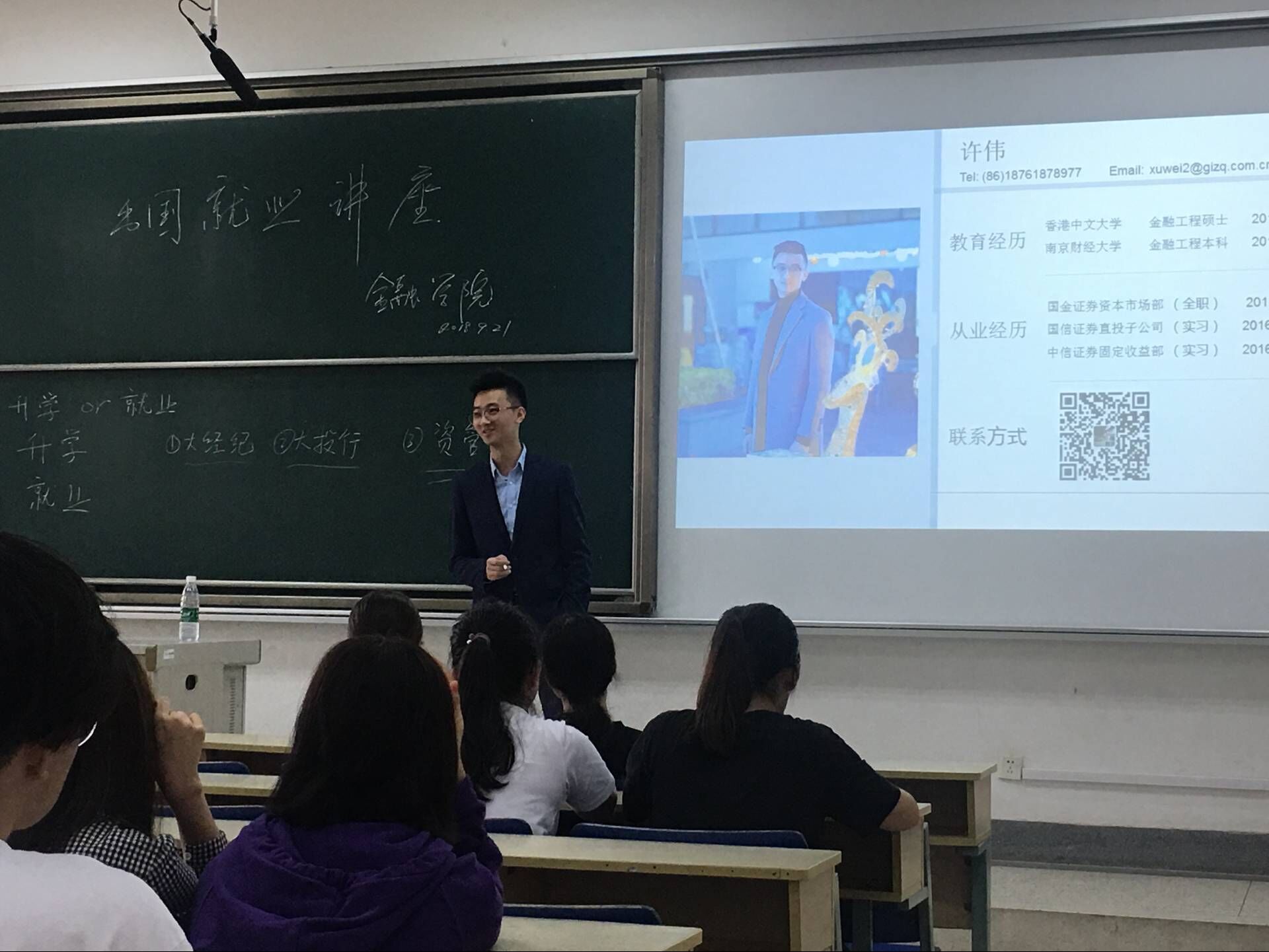 讲座一开始,许伟校友进行了自我介绍,回忆了其在南京财经大学至尊全讯555050读本科、香港中文大学读硕士的历程以及在中信证券、国信证券、国金证券的实习及工作经历。接着,许伟校友从“升学or就业”、“升学选择”、“就业经验”三个方面进行了深入浅出的阐述。
