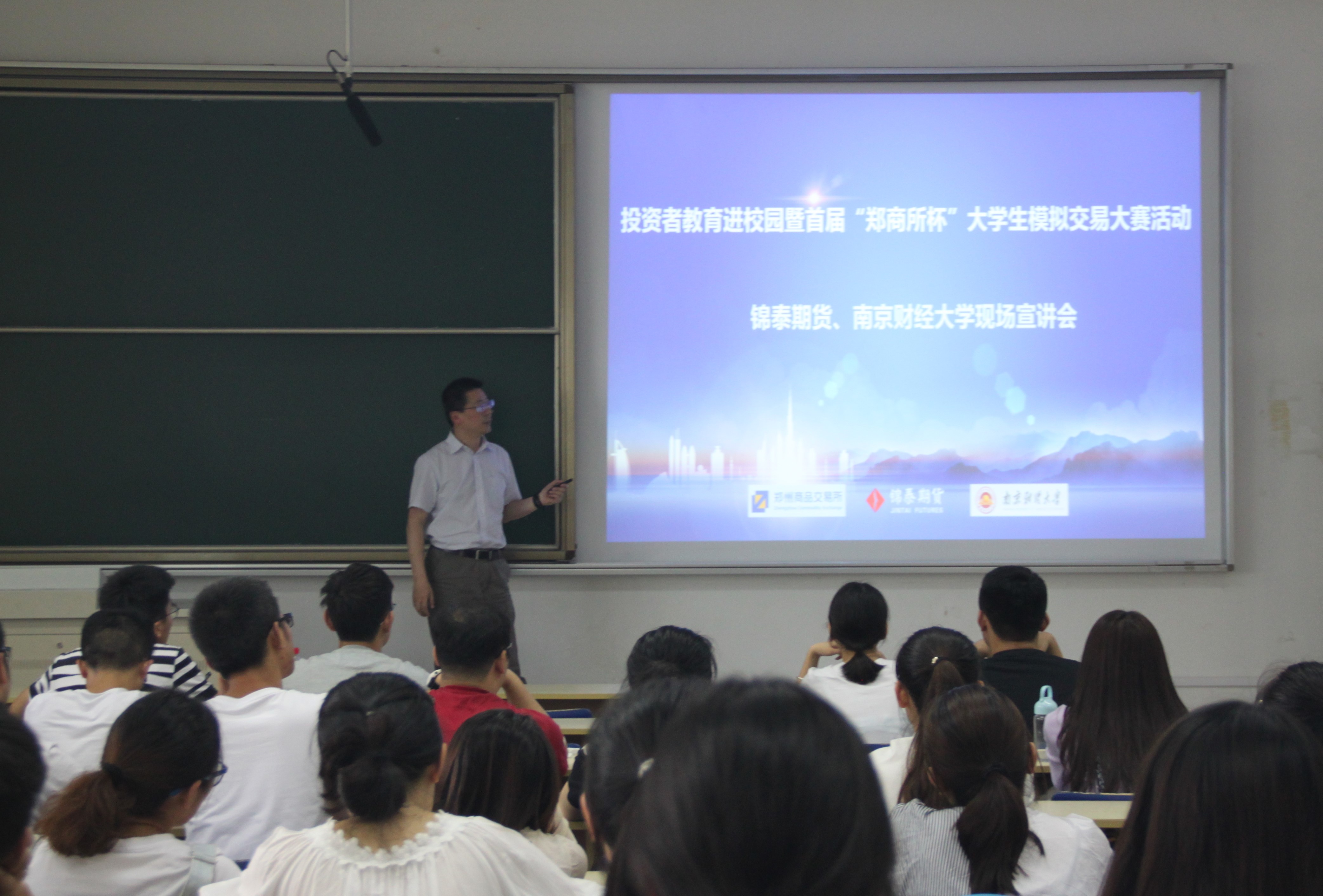 2018年6月15日16时,投资者教育进校园暨首届“郑商所杯”大学生模拟交易大赛南京财经大学讲座在德经楼113教室成功举办。南京财经大学至尊全讯555050部分学生参与了本次讲座,锦泰期货有限公司的谢景炎老师和俞水祥老师担任本次讲座的主讲人。
