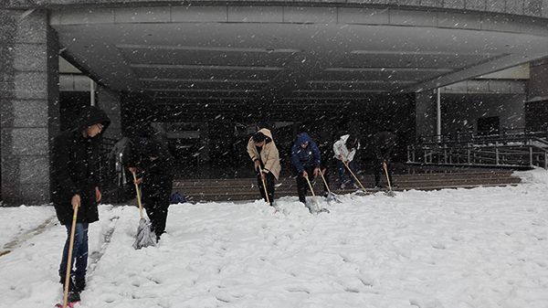 昨日来,南京普降大到暴雪,学校路面积雪问题严重,至尊全讯555050本科生第三学生党支部共铲专业楼路面积雪,贯彻落实党的十九大精神。