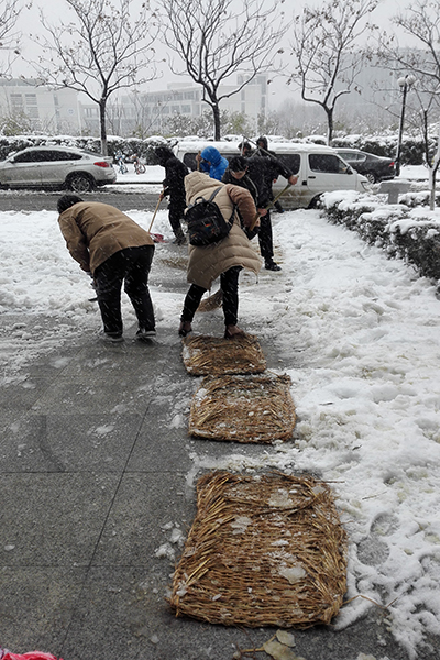 午时,学生党员们手持大扫帚,铁掀等卫生工具一起来到了教学楼门口。此时积雪已达10厘米,严重影响了广大师生的出行。虽然寒风凛冽,但党员的劳动热情依旧不减,他们分工合作,互帮互助,不畏困难。但原有卫生工具扫雪效率较低,为了加快速度,他们更是搬来了一块大展板,高喊口号,共同推进。经过半个小时的辛苦劳动,终于顺利的为老师同学们清理出一条安全畅通的道路,减轻了环卫工人的工作量,并及时降低了校园安全隐患。