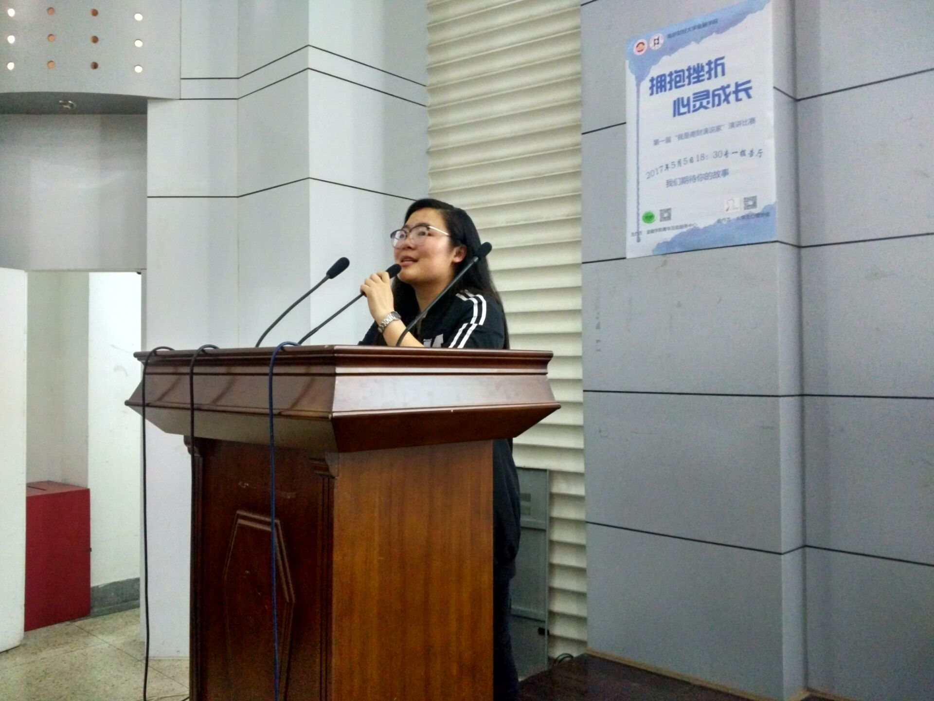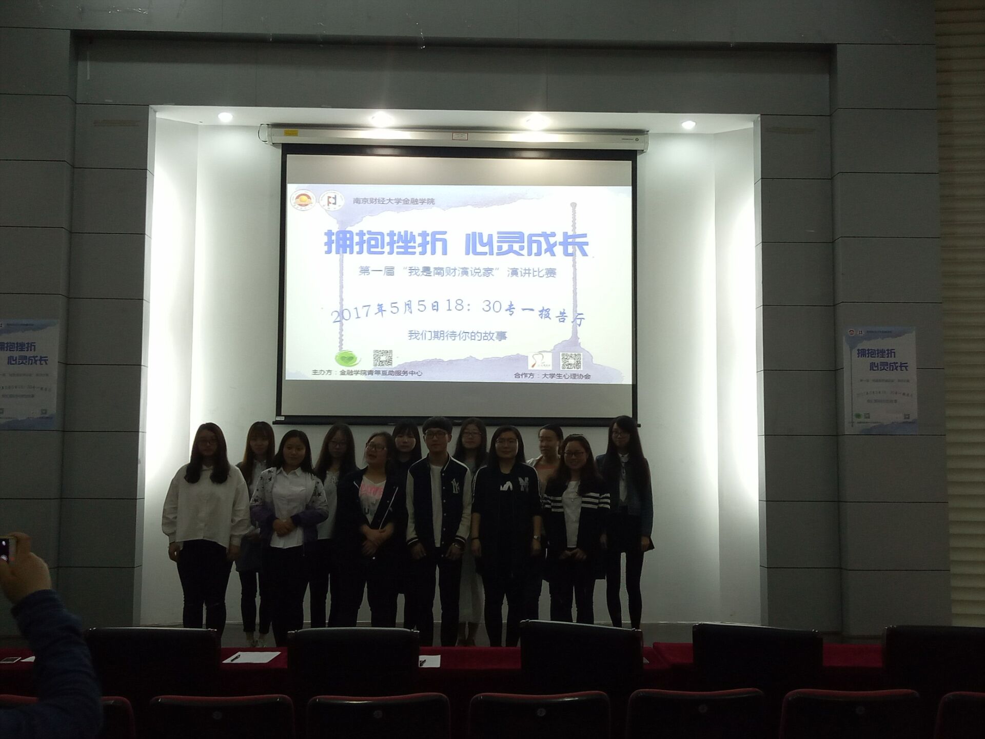 2017年5月5日晚,南京财经大学心理健康教育与咨询中心主办至尊全讯555050承办,在专一报告厅开展了“拥抱挫折,心灵成长”的演讲大赛,全校同学踊跃参与。此次大赛的评委为至尊全讯555050学工秘书黄炜老师,学生会主席高佳柳,心协主席范依蒙,青年互助服务中心主席陈晨,蒋文彬。