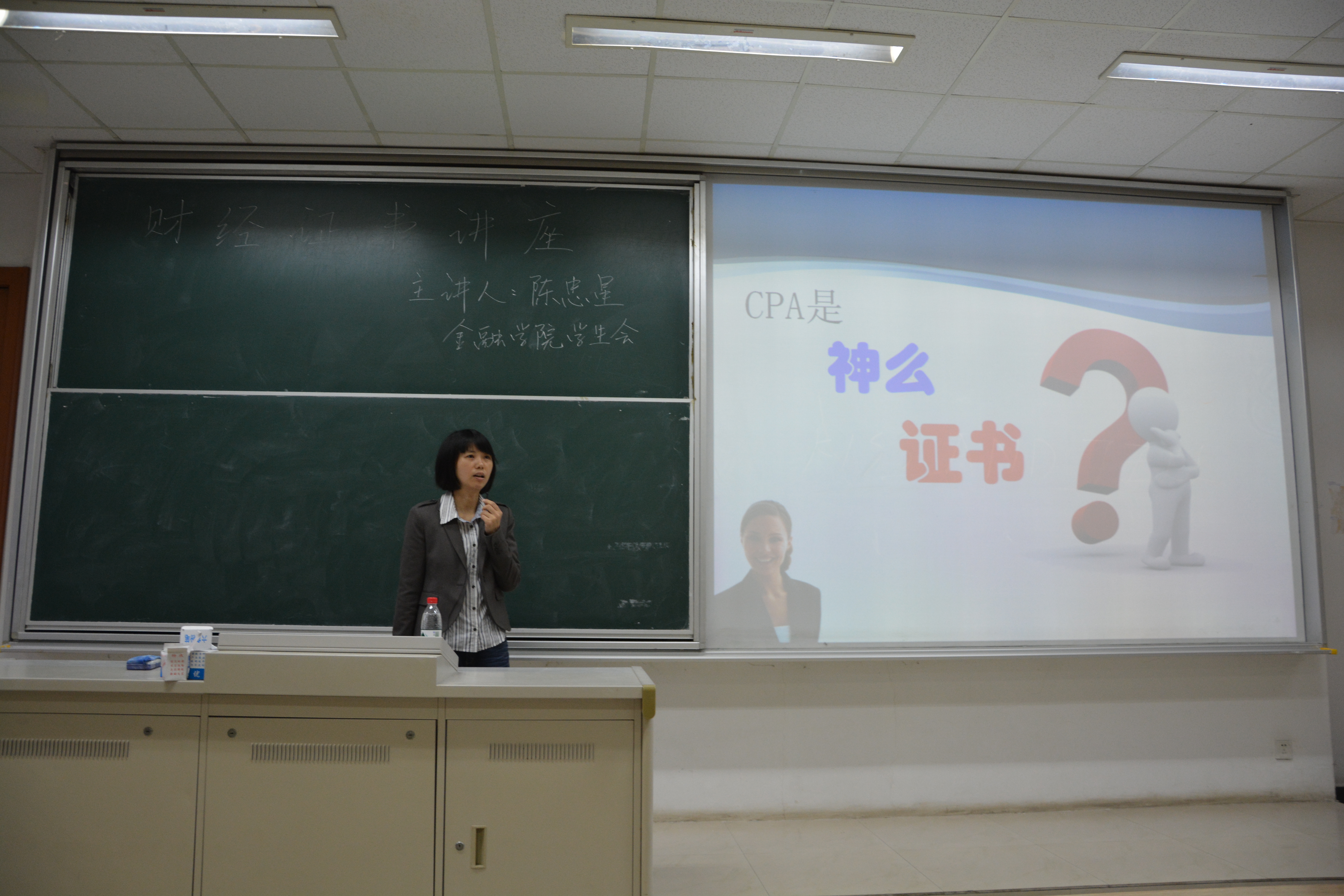 5月24日晚六点半,由至尊全讯555050学生会主办的财经证书讲座在教C103准时举行,此次讲座邀请到了有十年注会培训经验、国家高级注册会计师陈忠星女士作为此次的主讲人,并为我们讲解CPA、CFA证书的有效获取方法。