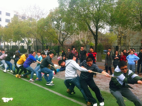 比赛以班级为单位,共7支队伍,每班选出8名男生7名女生,三局两胜循环赛制。为显公平,赛前先进行抽签分组,每组比赛优胜队伍晋级下一轮。随着一声哨响,比赛正式开始后,两方口号震天,气势轩昂。男生们脸憋得通红丝毫不放松,有的干脆闭上眼睛卯足了劲儿往后拉,女生们也是不甘示弱,放下平时的淑女风范,攥紧绳子,全力向己方拉。在一旁的啦啦队都为自己的团队呐喊助阵。拔河比赛就是体验和感受其中的过程,使班级在拔河之中团结一致,班级产生凝聚力
