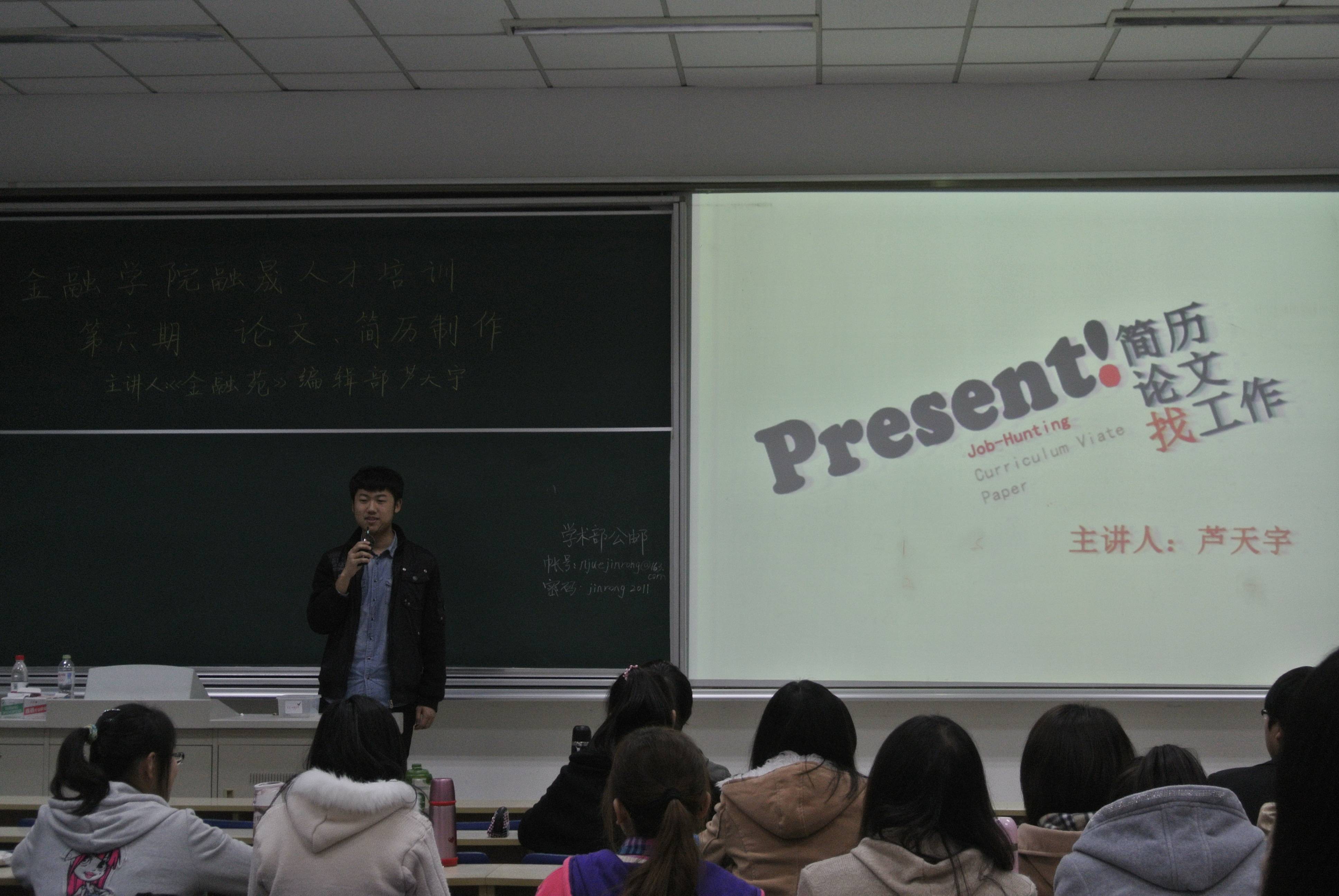 2013年3月19日晚18:30,至尊全讯555050融晟人才培训第六期在我校经济学科楼117如期举行。本次培训主要由至尊全讯555050《金融苑》编辑部的芦天宇同学讲述一些关于论文写作和制作简历的技巧与方法,帮助同学们为今后的求职之路打好基础。