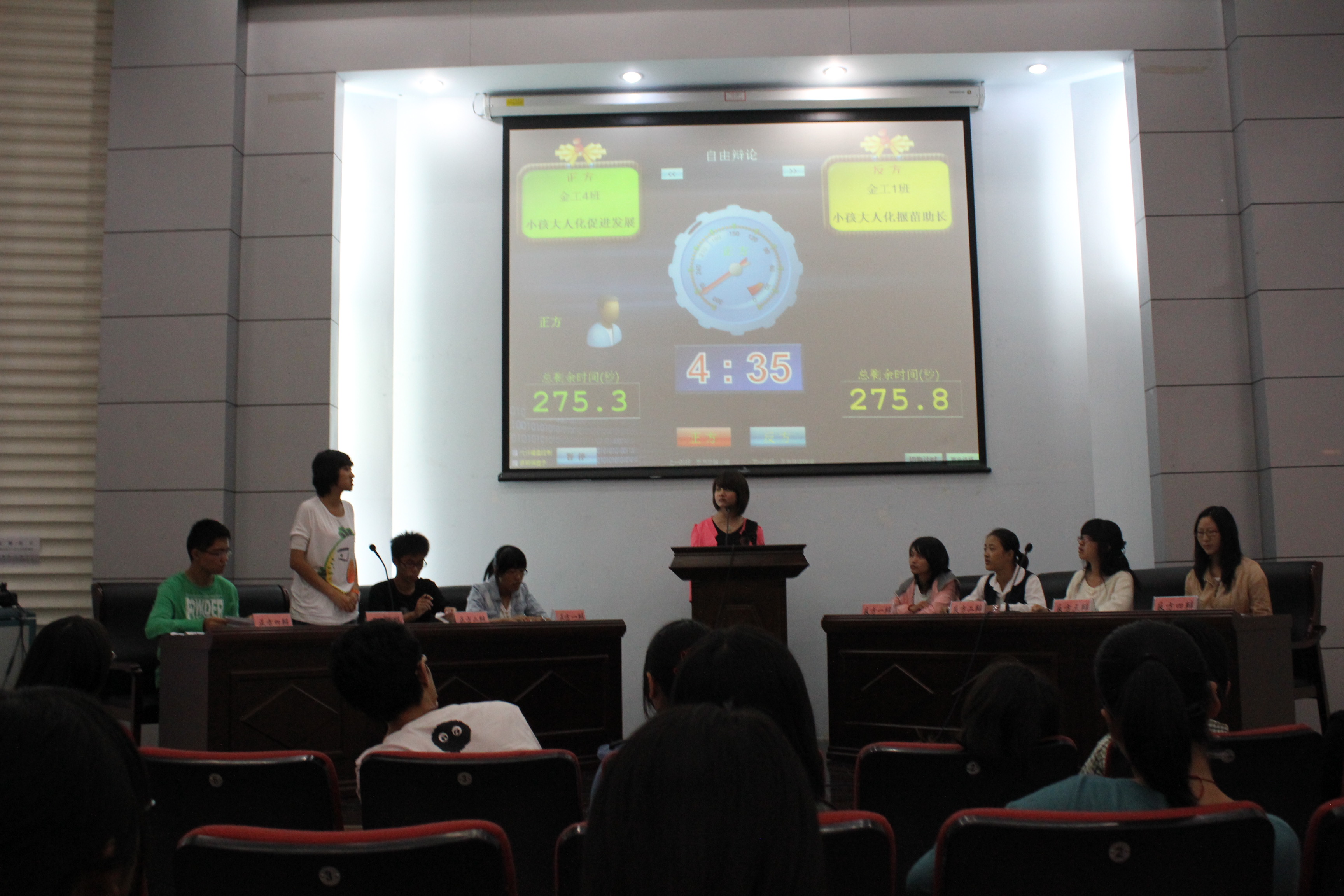 10月10日晚,由南京财经大学至尊全讯555050学生联合会和至尊全讯555050辩论队共同主办的2012年南财至尊全讯555050第九届新生辩论赛复赛顺利进行。晚上,专一报告厅座无虚席,初赛胜出的金工1班和4班以及保险1班和2班在这里进行了精彩的角逐。金融辩队的主席及各优秀辩手和学生代表组成了此次的评审团。