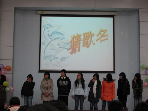 比赛共分为“歌词大比拼”、“歌名大比拼”、“单词大比拼”三个部分。团总支的杨虹老师和院学生会主席各部部长都在场观看了比赛。8个班的选手依次上台参加比赛,不时地掀起了场上气氛的阵阵高潮。战况也是非常地激烈,在第一部分中,金融0903班的选手表现出色,到了第二部分,金融0902的一位女选手奋起直追,在记歌名这个环节中显现出她不同于一般人的天赋,大半的分数都被她收入囊中。台上比的激烈,观众席上的啦啦队也热情地为每一位选手加油,用加油棒使劲地敲打着为台上的选手打气,让气氛一次又一次地被掀到了高点。比赛用的很多歌曲都是大家耳熟能详的,在场的每个同学都放下了学习的重担,轻松得集体狂欢了一下。